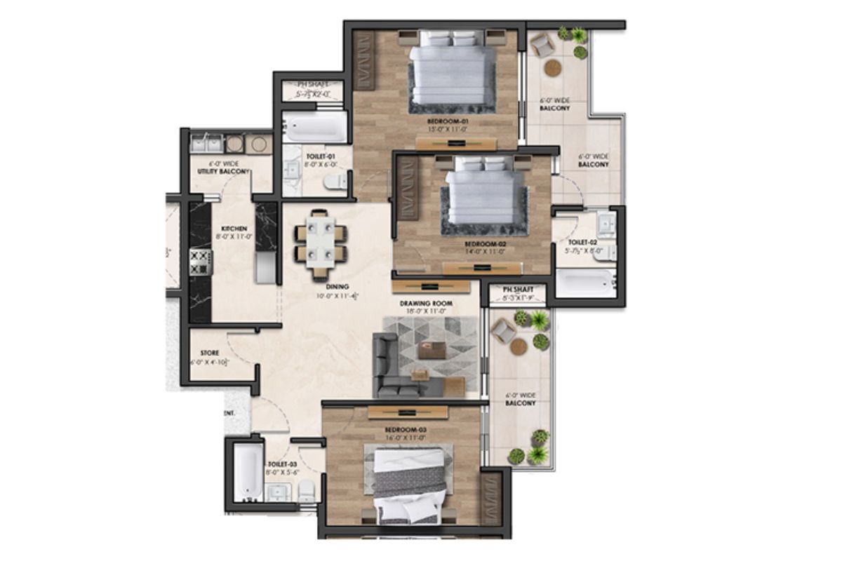 Each bedroom in this 3 BHK Flat in Mohali enjoys natural light and fresh air, while the spacious living room offers a warm area for family time. The kitchen is practical yet stylish, with ample storage and movement space, combining comfort and functionality for modern living.